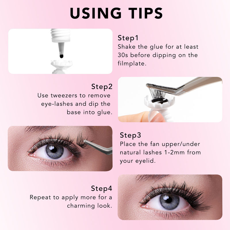 Procesul de aplicare este rapid și ușor. Începeți prin selectarea clusterelor dorite și așezându -le pe o suprafață plană. Apoi, aplicați o cantitate mică din lipiciul nostru de cluster DIY LASH pe baza fiecărui cluster. Lăsați lipiciul clusterului DIY Lash să se usuce câteva secunde și apoi apăsați ușor clusterele pe genele dvs. naturale.
